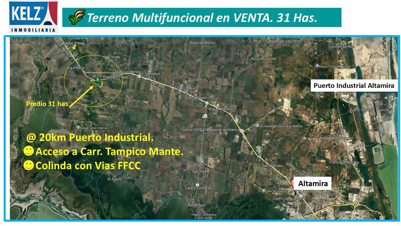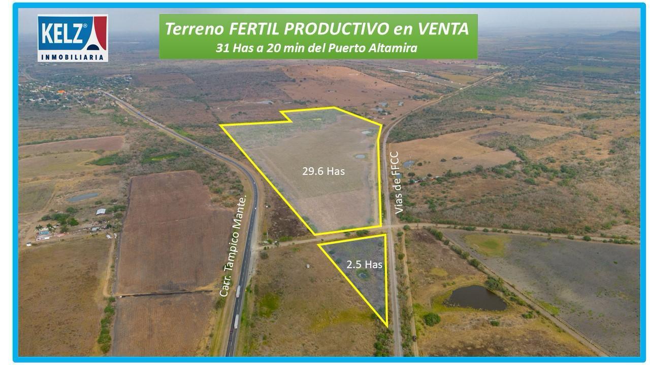 Terreno en venta de 31 HAS. (Dos porciones de 29 HAS Y 1 DE 2.5 HAS) Terreno listo para agricultura7 ganaderia o proyecto de infraestructura, tiene frente via de F.F.C.C En 919 mts y frente a vialidad hacia carretera Tampico Mante, ideal para proyecto logistico, uso agricola y ganadero.